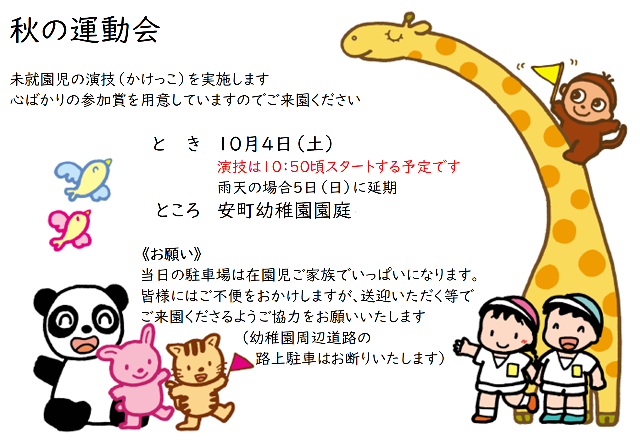 卒園児の皆様へ新入園の皆様へ 【秋の運動会】11月1日(土)に延期いたします 卒園児の皆様へ 2025.10.262026.02.22 判断が遅くなり申し訳ございません。 本日11月1日に延期いたします 日 時 令和7年11月1日(土) 雨天時は11月2日(日)に延期 9:30集合 9:45開始 11:30終了予定